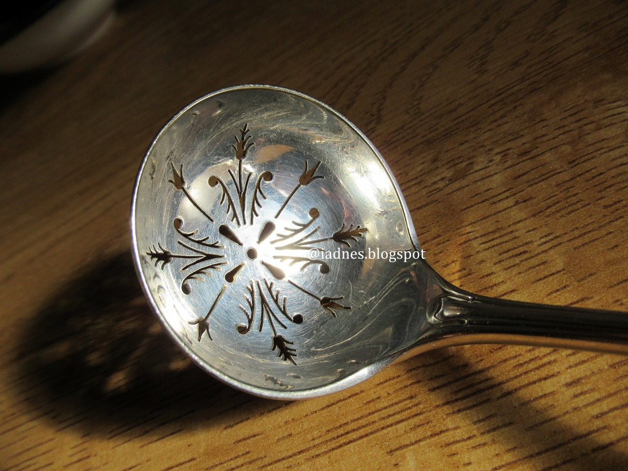 ポットに直接茶葉を入れ、カップに注ぐときに使用する「ティー・ストレーナー(tea strainer)」、いわゆる「茶こし」が欲しいなぁと多い、マーケットで一目ぼれして買ったコレ。珍しいデザインだなぁと思っていたら、ティー・ストレーナーではなく「シュガー・シフター・スプーン(sugar sifter spoon)」とよばれるものでした(笑)。シュガー・シフター・スプーンとは 18 世紀半ばに開発されたもので、形状はソース・レードルに似てますが、底に綺麗な模様の穴が開けられており、フルーツやお菓子の上に砂糖をフリフリ振りかけるためのスプーンだそうです。今は砂糖を振りかけるにも普通のスプーンでも十分と思ってしまうけど、かつてはお上品なスプーンが存在していたんですね。。。